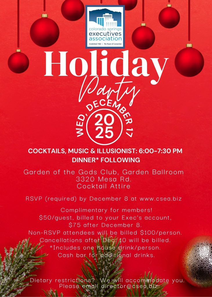 Please note:  Reservations made after RSVP expiration date (December 8, 2025) will be $75.  Also, all cancelled reservations after December 8 will be billed as we will have already called in our final RSVP count to the Garden of the Gods Club.